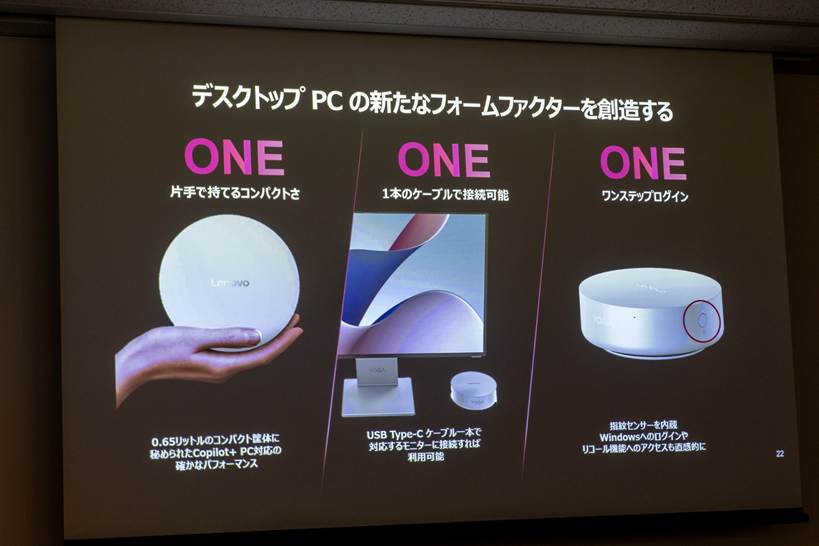 Yoga Mini i Gen 11は、インテル Core Ultra(シリーズ3)を搭載した容量約0.65リットルのミニPCです。片手で持てるサイズ感で、USB Type-Cケーブル1本で給電・映像出力・データ転送をまとめて処理できます。電源ボタンに指紋センサーを内蔵しており、ワンステップでのログインが可能です。