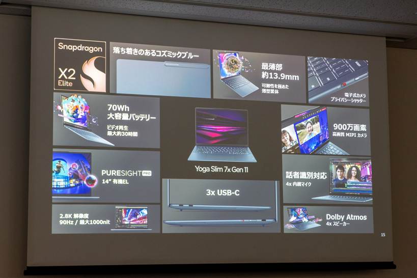 Yoga Slim 7x Gen 11はQualcomm Snapdragon X2 Eliteを搭載した14インチモバイルノートです。重量は約1.14kg、バッテリーは70Wh。発表会では社内テストによる約30時間の連続動画再生という数値が紹介されました(正式なバッテリー駆動時間の公表値は後日とのことです)。