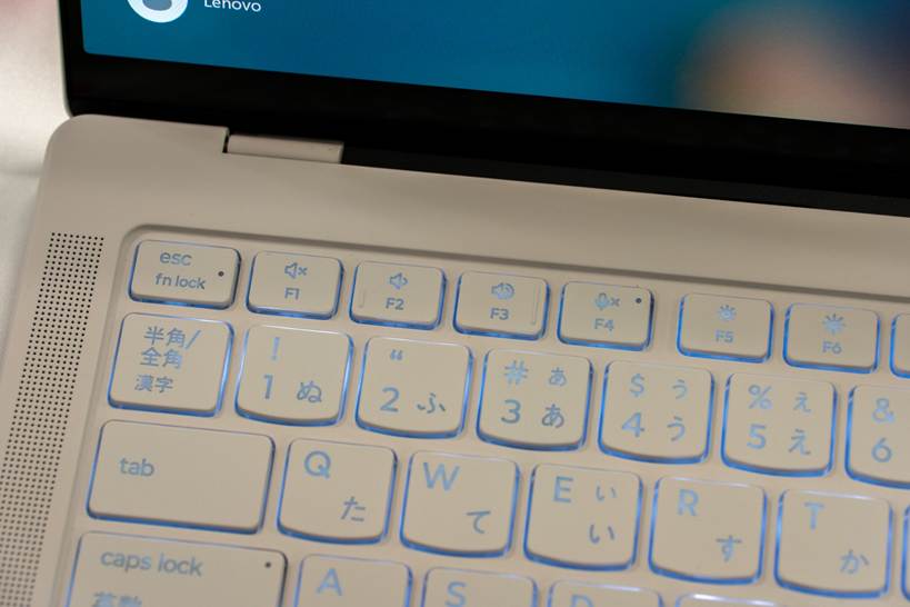 キーボードはキーストローク1.5mm、キートップに0.3mmの凹み(スマイルシェイプ)を設けており、打鍵感の改善を図っています。タッチパッドは120×75mmの大型サイズでハプティクス対応。F2/F3キー横やEnterキーなど、タッチタイピング時に位置を把握しやすくするための突起(トップバンパー)も設けられており、アクセシビリティへの配慮も見られます。