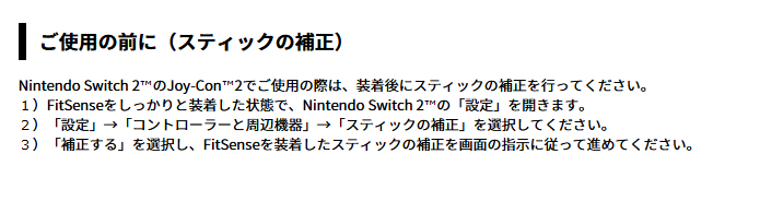 ※追記:うちでは特に問題がありませんでしたが、「スティックを倒しても奥まで反応しない」というフィードバックもあったとのことです。Joy-Con 2で使う場合はFitSense装着後に、スティックの補正をすると動作が確実になるとのこと。詳細は下記URLの、「ご使用の前に(スティックの補正)」をご確認ください。https://www.aiuto-jp.co.jp/products/product_5996.php