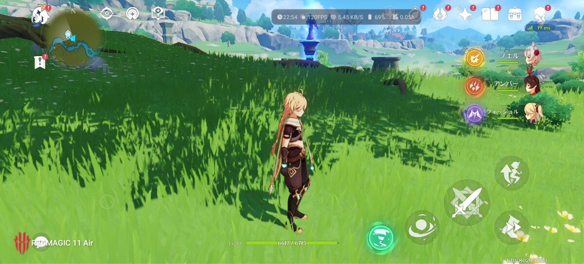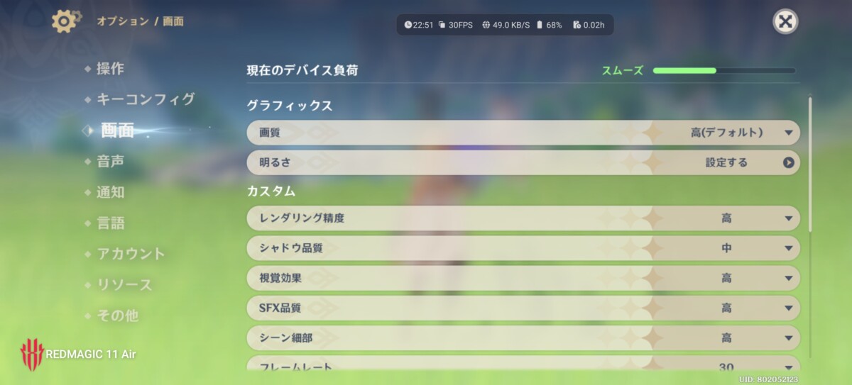 『原神』はデフォルトでグラフィックのプリセットが「高」で、デバイス負荷は「スムーズ」。FPS60に上げるとデバイス負荷が「非常に高い」になりますが、動作自体は問題ありませんでした。