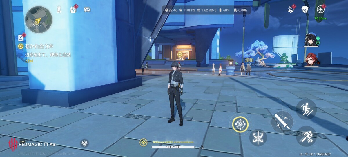 バッテリー持ちに関しては、鳴潮を1時間ほどプレイしてバッテリー消費は約13%でした(解像度「高」、FPS「60」。ゲームスペースのCPU設定は「バランス」)。設定次第ではありますが、4時間~5時間程度は問題なくプレイできそうです。YouTubeの連続再生では、2時間で5%の消費となりました。