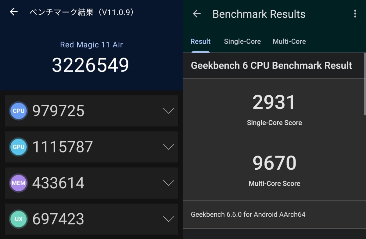 ▲AnTuTu v11(左)とGeekbench 6(右)のスコア