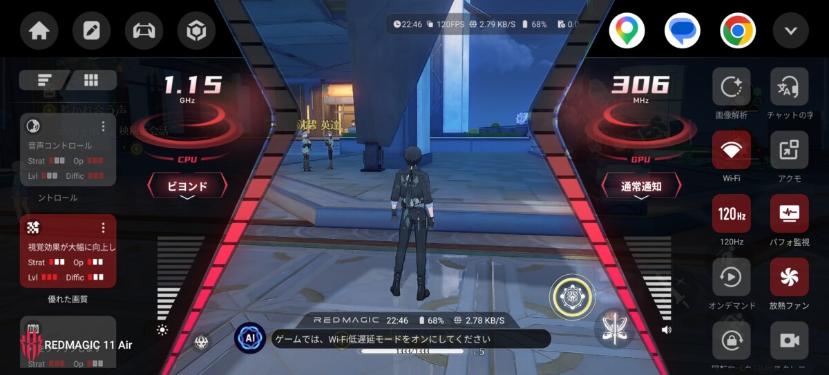 REDMAGICには、ゲームスペースから有効にできるフレーム補間機能があります。ゲームスペースで「優れた画質」から画質を「高い」、フレームレートを「高い」に設定したうえで、リフレッシュレートを「120Hz」にすることで利用できます。