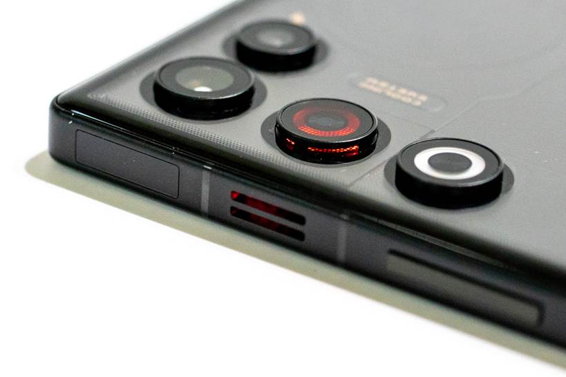 ▲背面カメラの下にあるのが物理ファン。動作中は光ります。写真だとわかりにくいですが、カメラっぽい出っ張りの側面に隙間があり、そこから吸気。側面のスリットから排気しています
