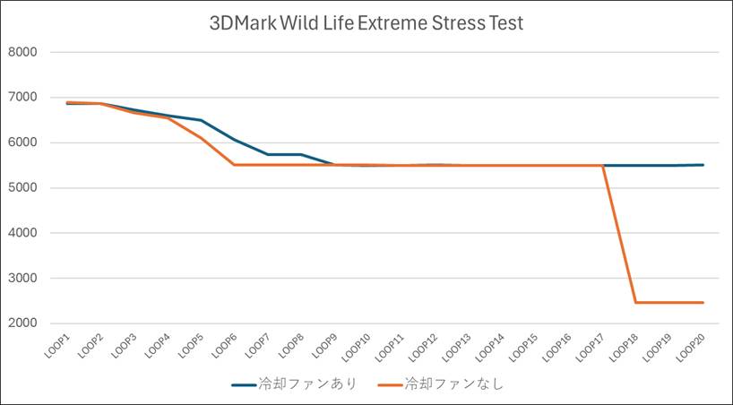 Wild Life Extreme Stress Testは20回連続でベンチマークを実施するストレステストですが、冷却ファンをオン、オフそれぞれの状態の結果をグラフにすると下記のようになります。