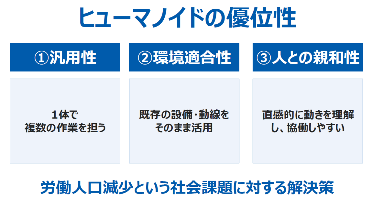 ヒューマノイドの優位性としては、1台で複数作業を担える汎用性、既存の設備や動線をそのまま使いやすい環境適合性、人にとって動きが理解しやすい親和性の3点を挙げています。