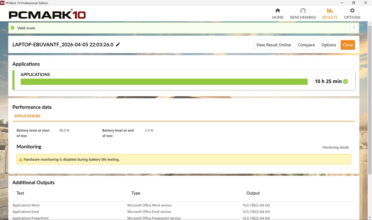 カタログスペックでのバッテリー駆動時間は約22時間。JEITA測定法3.0では動画再生時に約12.1時間、アイドル時に約13.8時間となっています。また、PCMark 10のバッテリーベンチマーク(Applications)では、10時間25分という結果になりました。