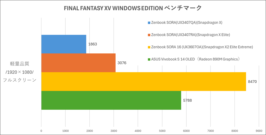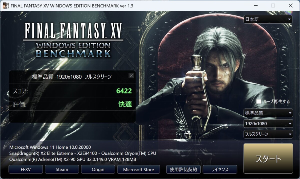 試しに、ベンチマークとしては負荷が高めなFINAL FANTASY XV WINDOWS EDITIONベンチマークを実行した結果が下記。ASUS Zenbook SORA 16 (UX3607OA)は、軽量品質で「8470(快適)」、標準品質でも「6422(快適)」となりました。設定次第ではゲーム用途にも対応できる性能です。