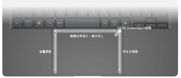 タッチパッドは大型のスマートジェスチャー対応。左端上下スライドで音量調整、上端左右スライドで早送り/巻き戻し、右端上下スライドで明るさ調整が行えます。このジェスチャー機能は使いこなすとなかなか便利で、前モデルから継続しているポイントです。