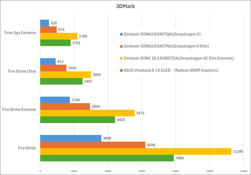 グラフィック性能を測る3DMarkの結果は下記の通り。比較として、2025年発売の14型 ASUS Zenbook SORA、Snapdragon X Elite搭載のUX3407RA(32GB)、Snapdragon X搭載のUX3407QA(16GB)、Vivobook S 14 OLEDのスコアも載せています。