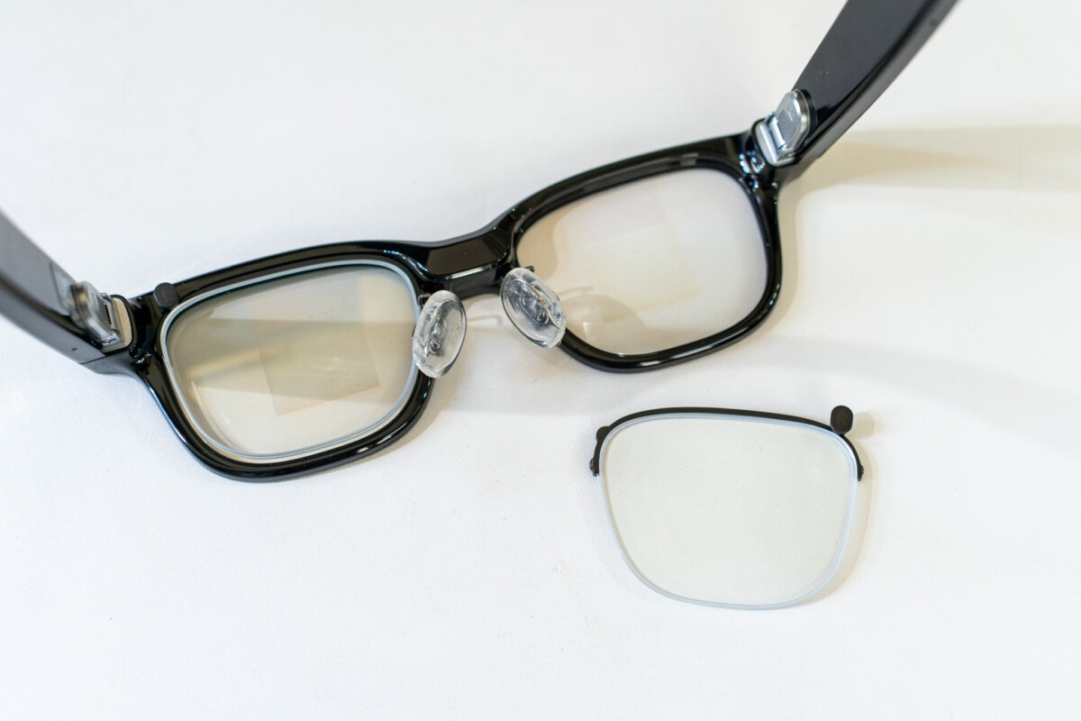 レンズ部分に度は入っておらず、度付きレンズが必要な場合は別売りのクリップオン式フレームを使います。マグネットで着脱できる仕組みで、ディスプレイ搭載スマートグラスでは度付きレンズの対応が難しいケースが多いのですが、この方式なら比較的簡単にレンズを作成可能。ARグラス、スマートグラス界隈で有名な「JUN GINZA」でも度付きレンズの作成が可能です。