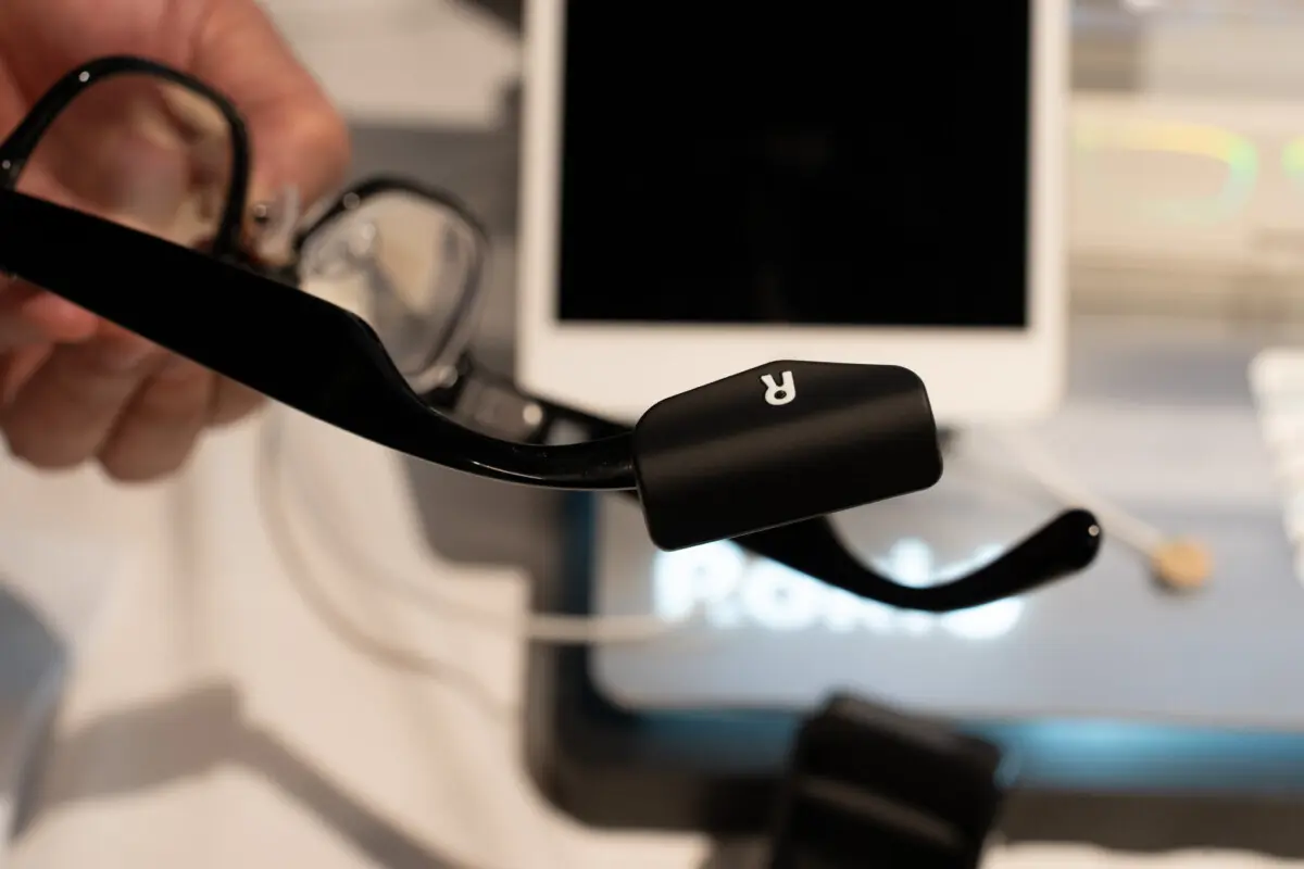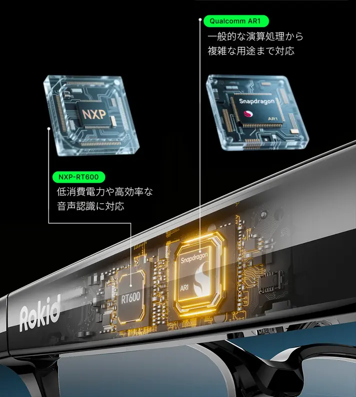 プロセッサはQualcomm Snapdragon AR1 Gen 1を搭載。音声処理用に別途NXP RT600も内蔵しており、右側のテンプル(つる)にこれらの基板が収められています。メモリは2GB、ストレージは32GBです。