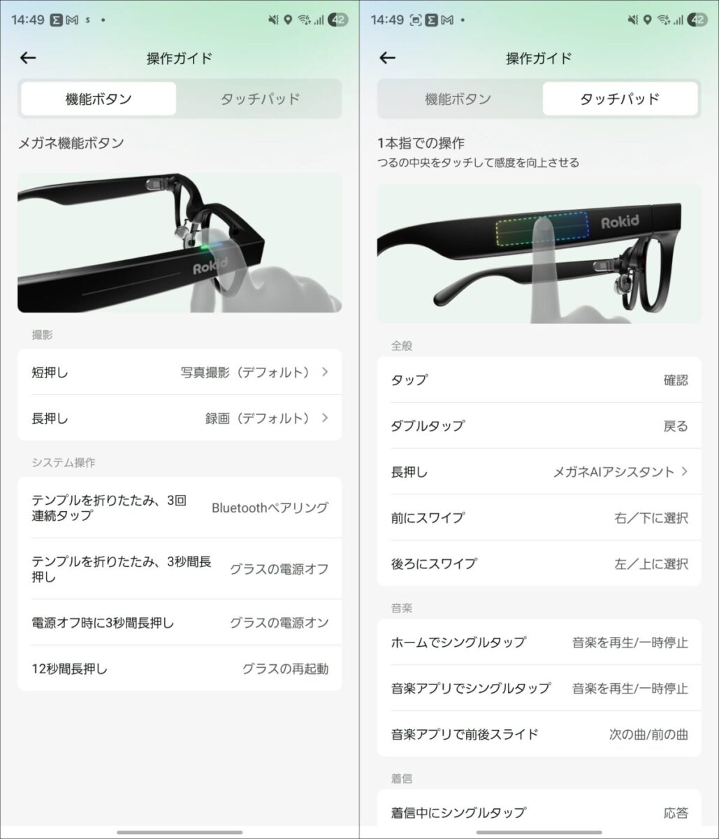 操作は右側テンプルのタッチパッドで行います。前後のスワイプやタップで項目の選択や決定、戻るといった操作ができ、慣れてしまえば直感的です。左右のテンプルにはスピーカーも内蔵されており、4基のマイクと合わせて音声操作や通話にも対応します。