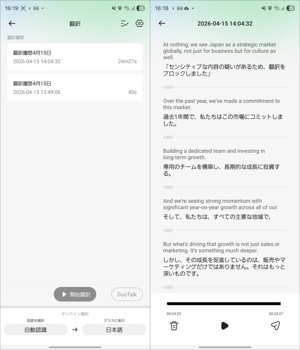 また、翻訳機能はバッテリー消費が大きい点も気になりました。使用中、およそ1分で約1%のバッテリーを消費するペースだったので、フル充電でも100分程度しかもちません。長時間の利用にはバッテリーカプセルの併用が必須と言えそうです。