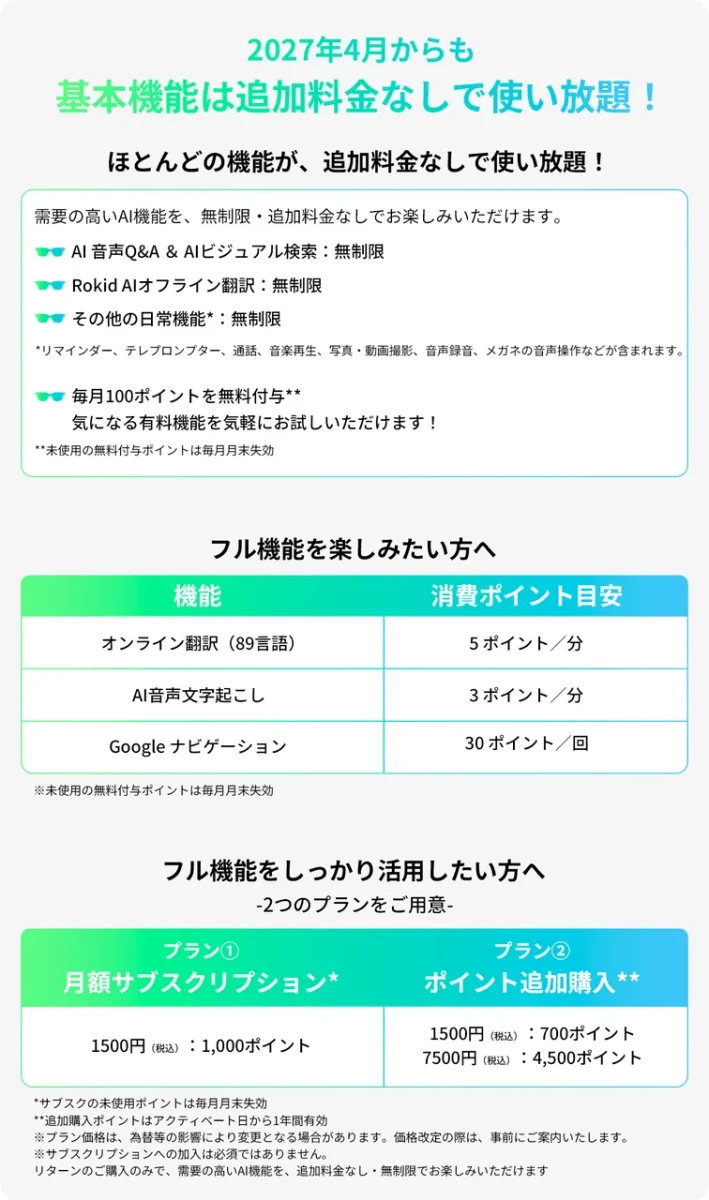 なお、2027年3月まではフル機能を無料で利用できますが、それ以降は、オンライン翻訳やAI音声文字起こし、Googleナビゲーションの一部機能はポイント消費制で、無料枠を超える利用には追加購入やサブスクリプションが必要になるとのことです。