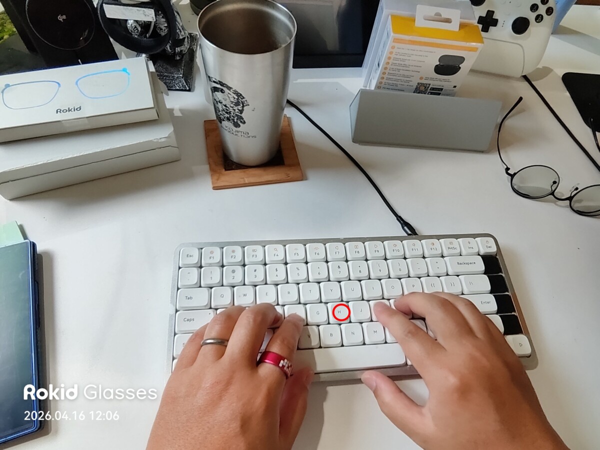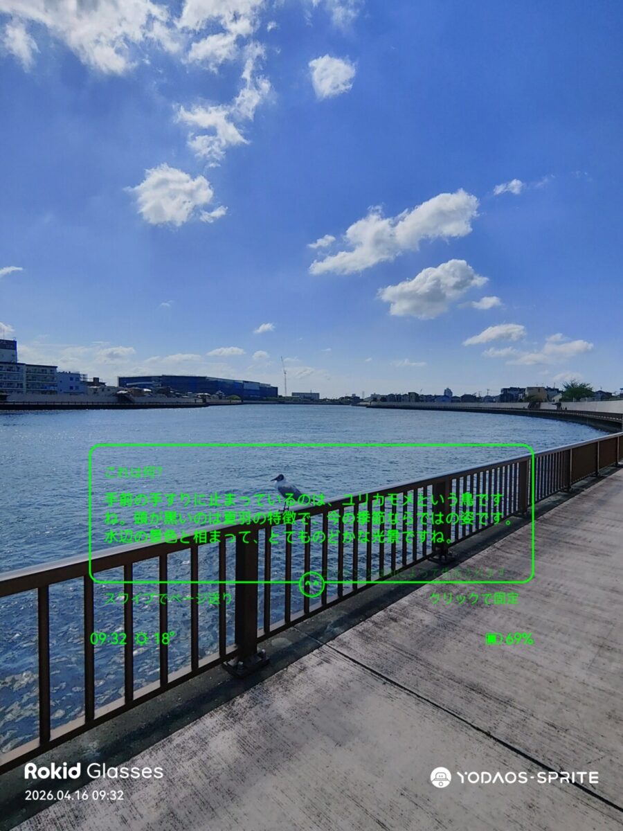 「Hi Rokid」と話しかけるとAIアシスタントが起動します。「これは何?」と聞けば、カメラに映っているものを認識し、文字と音声の両方で解説してくれます。料理や建物、看板など、対象を問わず幅広く対応してくれるのは便利です。「撮影して」と言えば写真撮影も可能で、ハンズフリーでの操作がスムーズに行えます。