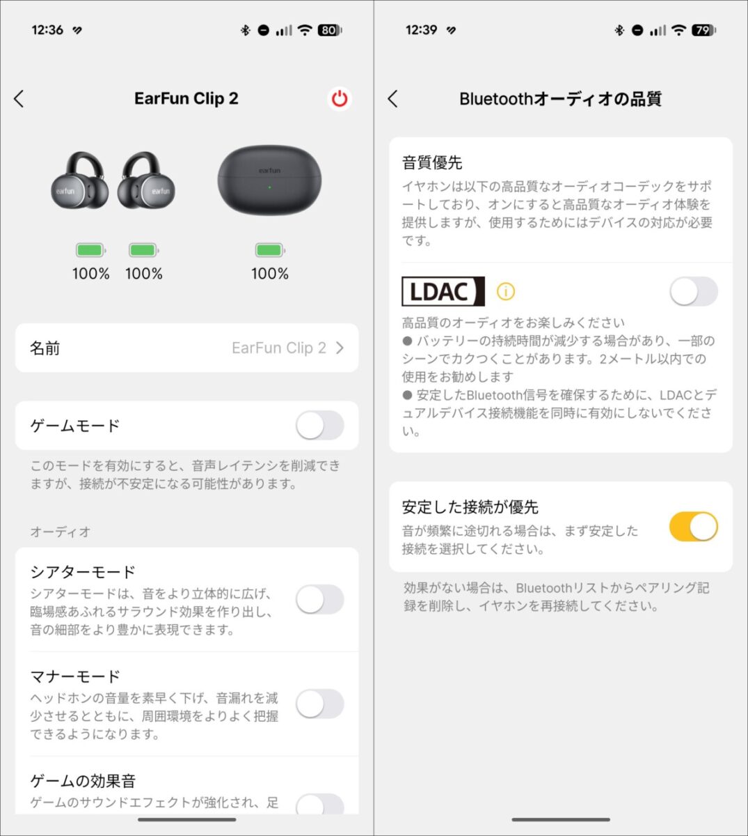 EarFunのイヤホンではおなじみとなっている「EarFun Audio」アプリに対応しており、LDACのオン・オフ切り替えやイコライザ設定などが行えます。