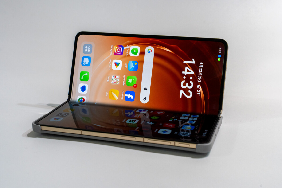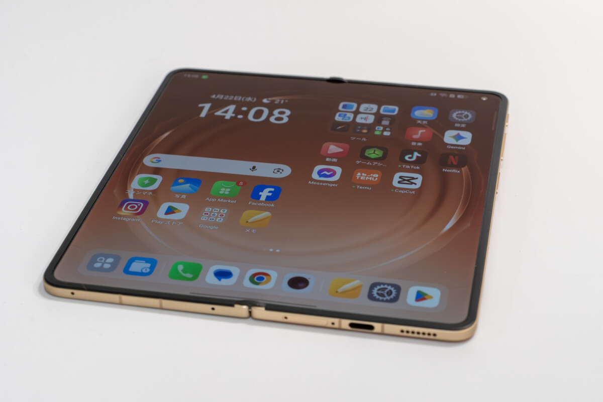 そして最大の訴求点である折り目の目立たなさについては、実際に指でなぞっても段差はほとんど感じず、画面表示中もまったくと言っていいほど目につきません。光の当て方で浮かび上がる程度で、正面からコンテンツを見ているぶんには存在を忘れてしまうほど。OPPOが「世界一フラット」を謳うのも大げさではないと感じました。